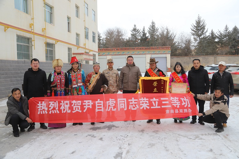喜报队伍首先来到长方村程瑞家中,程瑞的父母早早等候在院门前,左邻右舍闻讯也纷纷赶来,锣鼓声、欢笑声交织一片,小院洋溢着浓浓的喜庆气氛。肃南县公安局主要负责人为程瑞父母郑重佩戴“一人立功、全家光荣”绶带,送上喜报和奖励金,并亲切交谈:“程瑞在部队表现突出,为家乡争了光,感谢你们为国防事业培养了好儿子!”程父激动地接过喜报,眼眶微红:“孩子能立功,全靠部队培养和政府支持!我们一定继续鼓励他扎根军营,再立新功!”