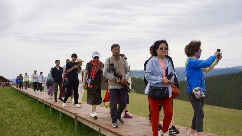 8月的康乐草原水草丰美、绿意犹存。近日,来自新疆、北京、天津等地的五百余名游客,乘坐“中铁集团”旅游专列走进肃南县康乐草原,亲身感受大美肃南23度的凉爽。