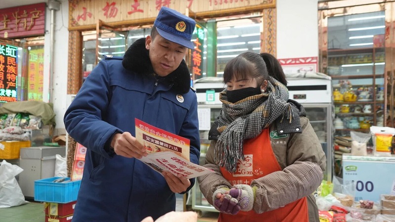 在肃南县公安局城区派出所,民辅警们正穿梭于人来人往的街头巷尾。年货摊前人潮涌动,闪烁的警灯融进热闹的街景。与此同时,警力还深入辖区宾馆与沿街店铺,在浓浓年味中同步开展治安检查和隐患排查,从消防设施是否完好,到实名登记是否落实,民警逐一细致核查,督促经营者守好节日安全关。熙攘的人流里,藏蓝身影步履不停,以动态巡防与静态检查织密防护网,让平安与年味一同抵达千家万户。