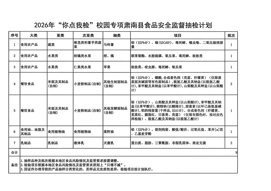 根据线上线下同步发布的调查问卷结果,肃南县市场监督管理局委托张掖市质量检验检测研究院开展校园专项监督抽检,共抽检自制面制品、食用农产品、菜籽油、灭菌乳等9个批次。抽检结果全部合格并向社会公示。