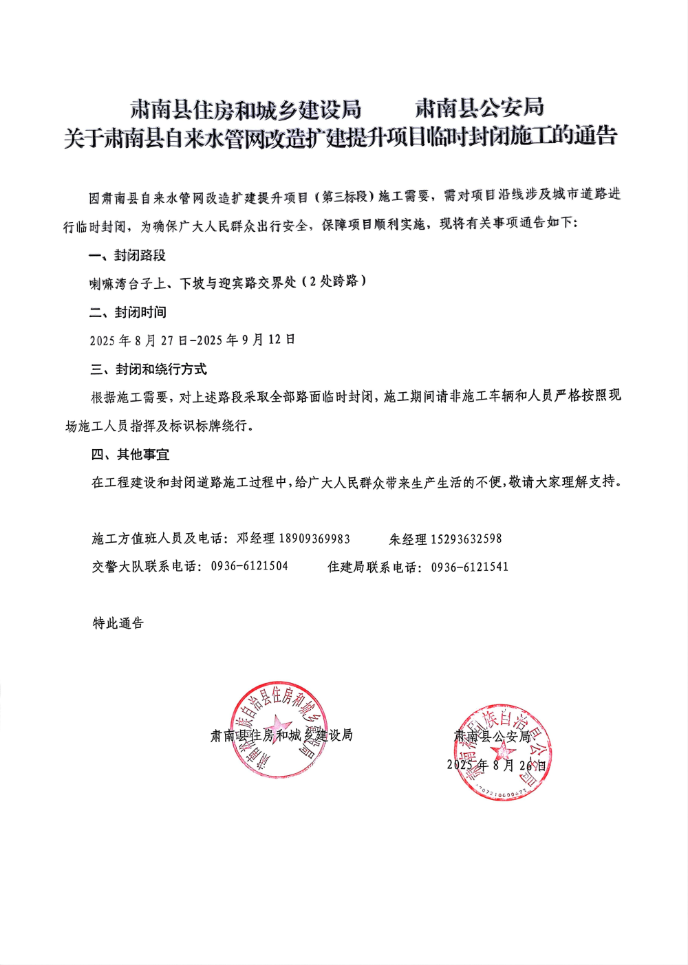 关于肃南裕固族自治县自来水管网改造扩建提升项目临时封闭施工的通告