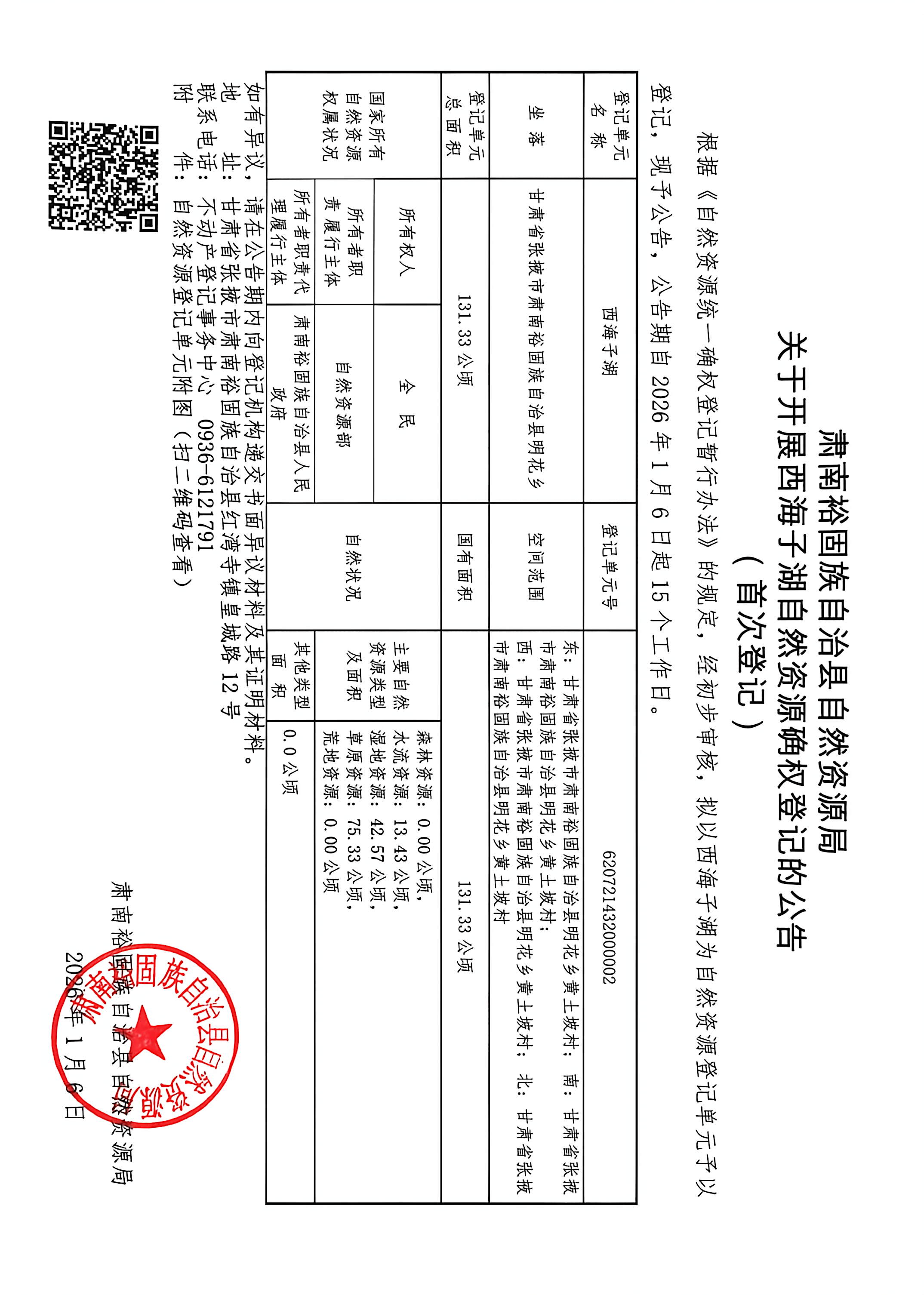 关于开展西海子湖自然资源确权登记的公告(首次登记)