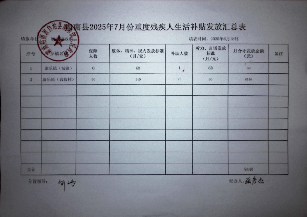 肃南县康乐镇2025年7月份重度残疾人生活补贴发放汇总表