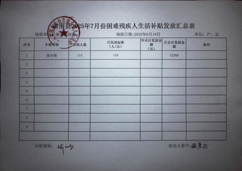 肃南县康乐镇2025年7月份困难残疾人生活补贴发放汇总表