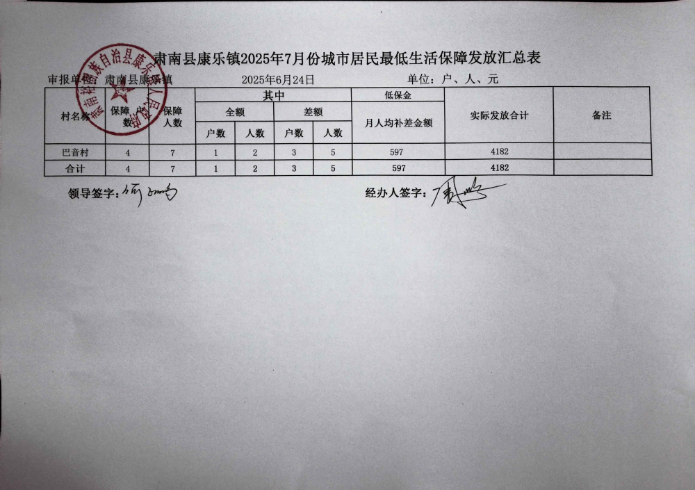 肃南县康乐镇2025年7月份城市居民最低生活保障发放汇总表