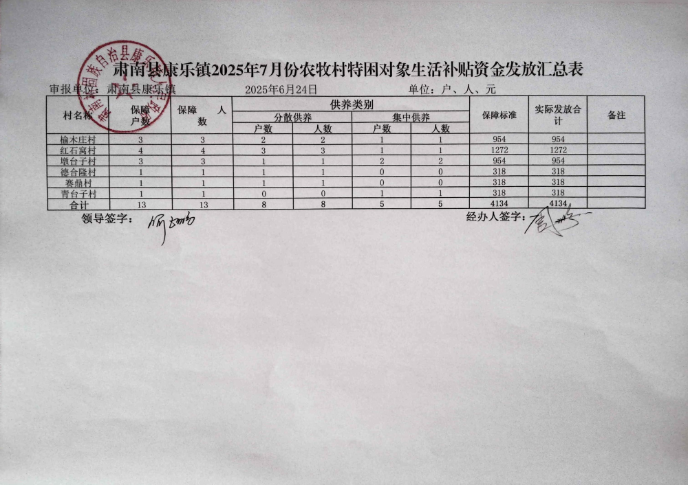 肃南县康乐镇2025年7月份农牧村特困对象生活补贴资金发放汇总表