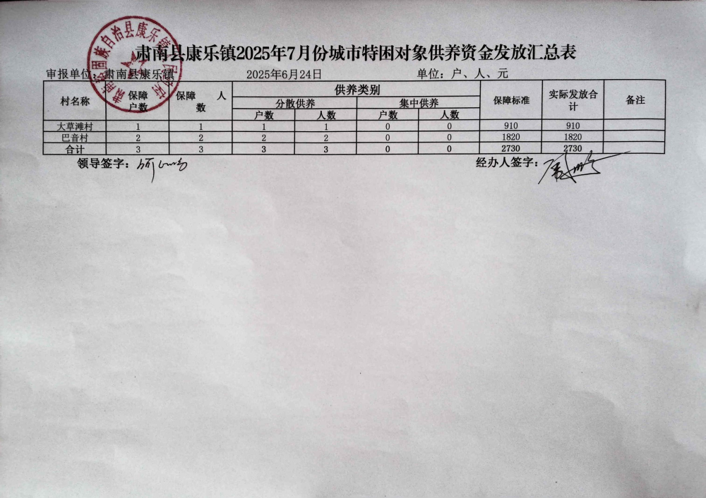 肃南县康乐镇2025年7月份城市特困对象供养资金发放汇总表