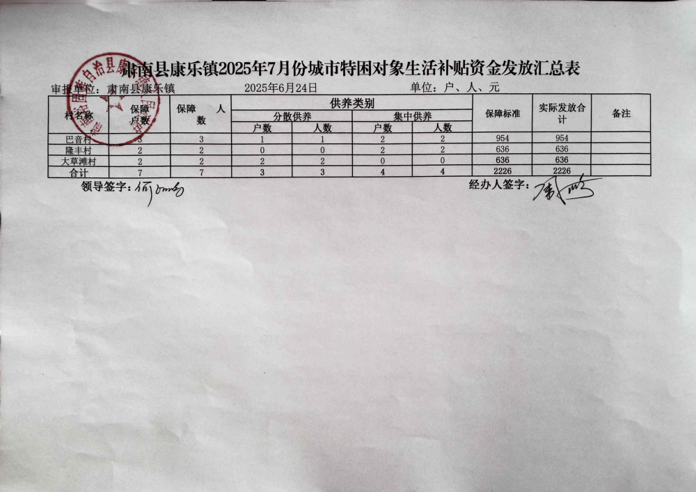 肃南县康乐镇2025年7月份城市特困对象生活补贴资金发放汇总表