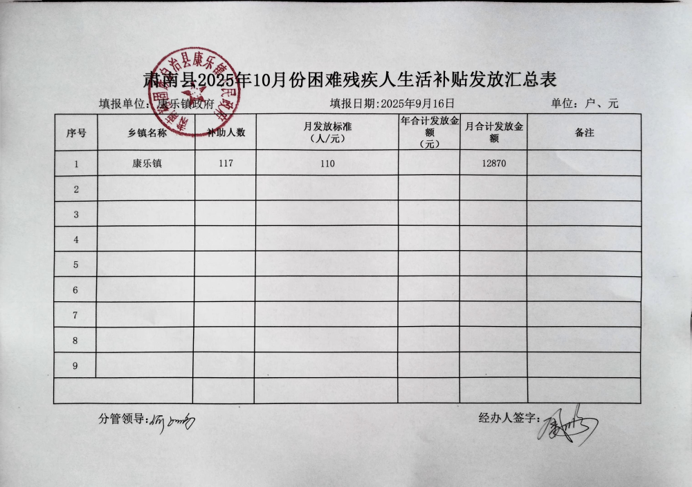 肃南县康乐镇2025年10月份困难残疾人生活补贴发放汇总表