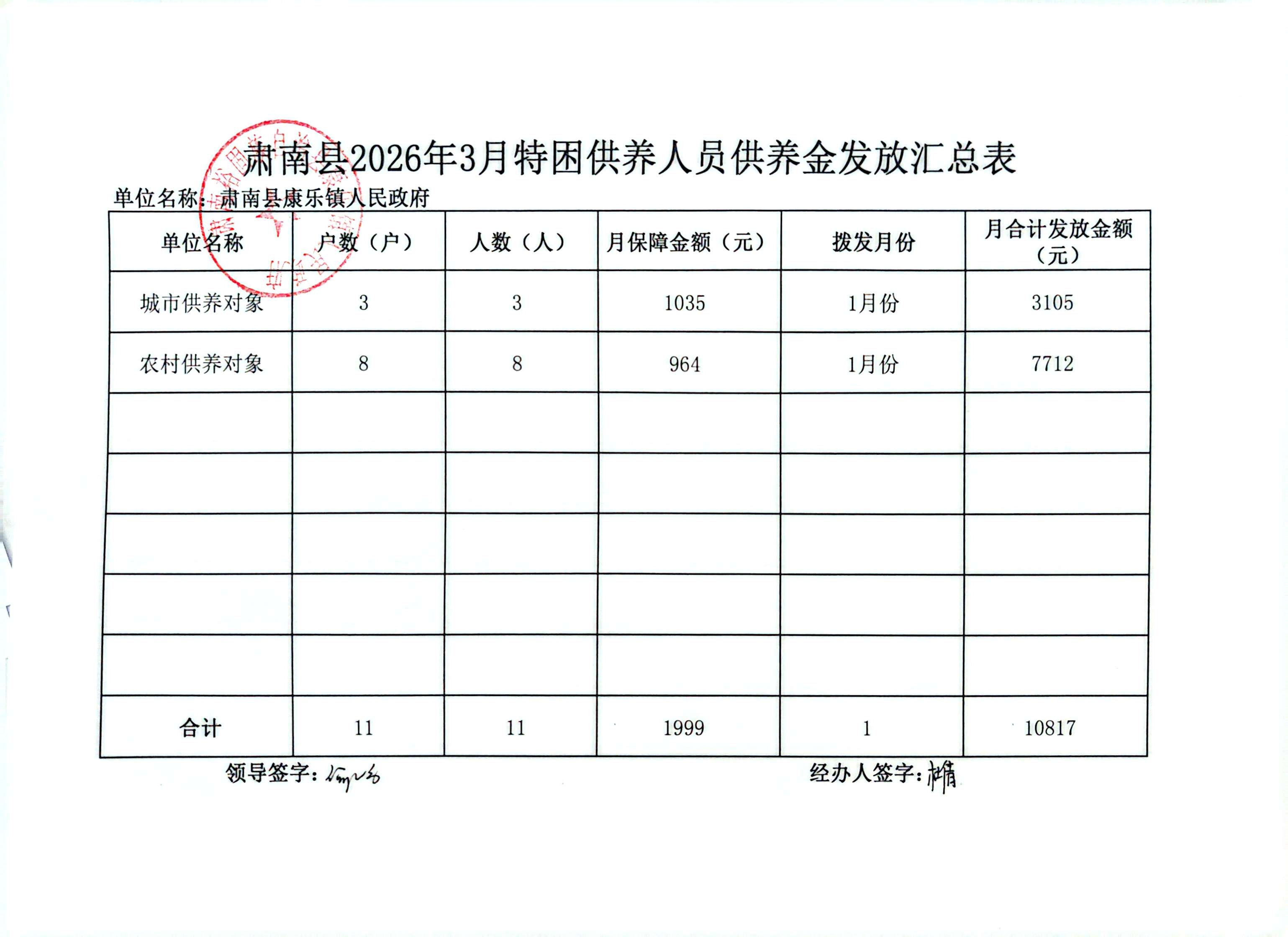 肃南县康乐镇2026年3月特困供养人员供养金发放汇总表