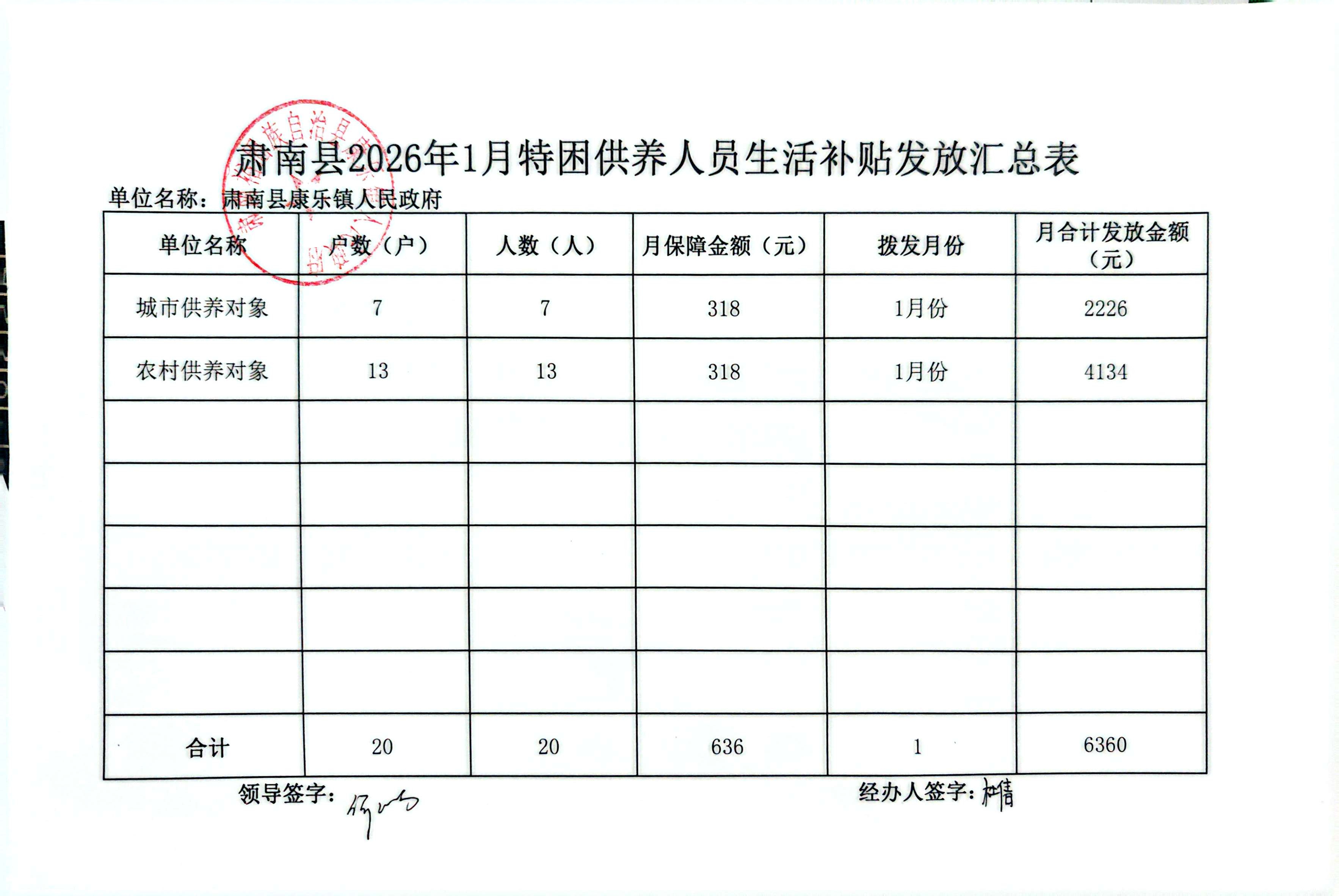 肃南县康乐镇2026年1月特困供养人员生活补贴发放汇总表