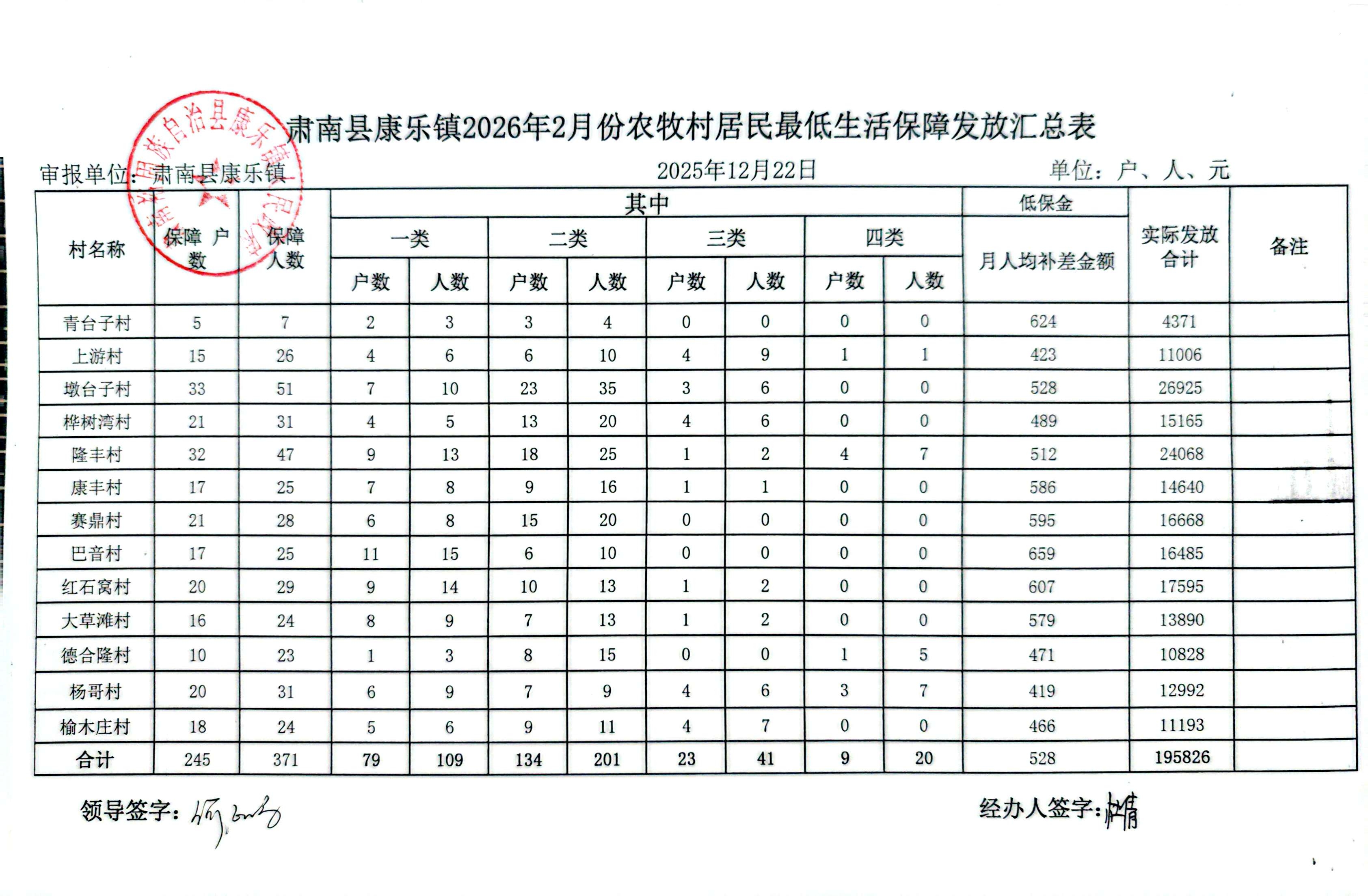 肃南县康乐镇2026年2月份农牧村居民最低生活保障发放汇总表