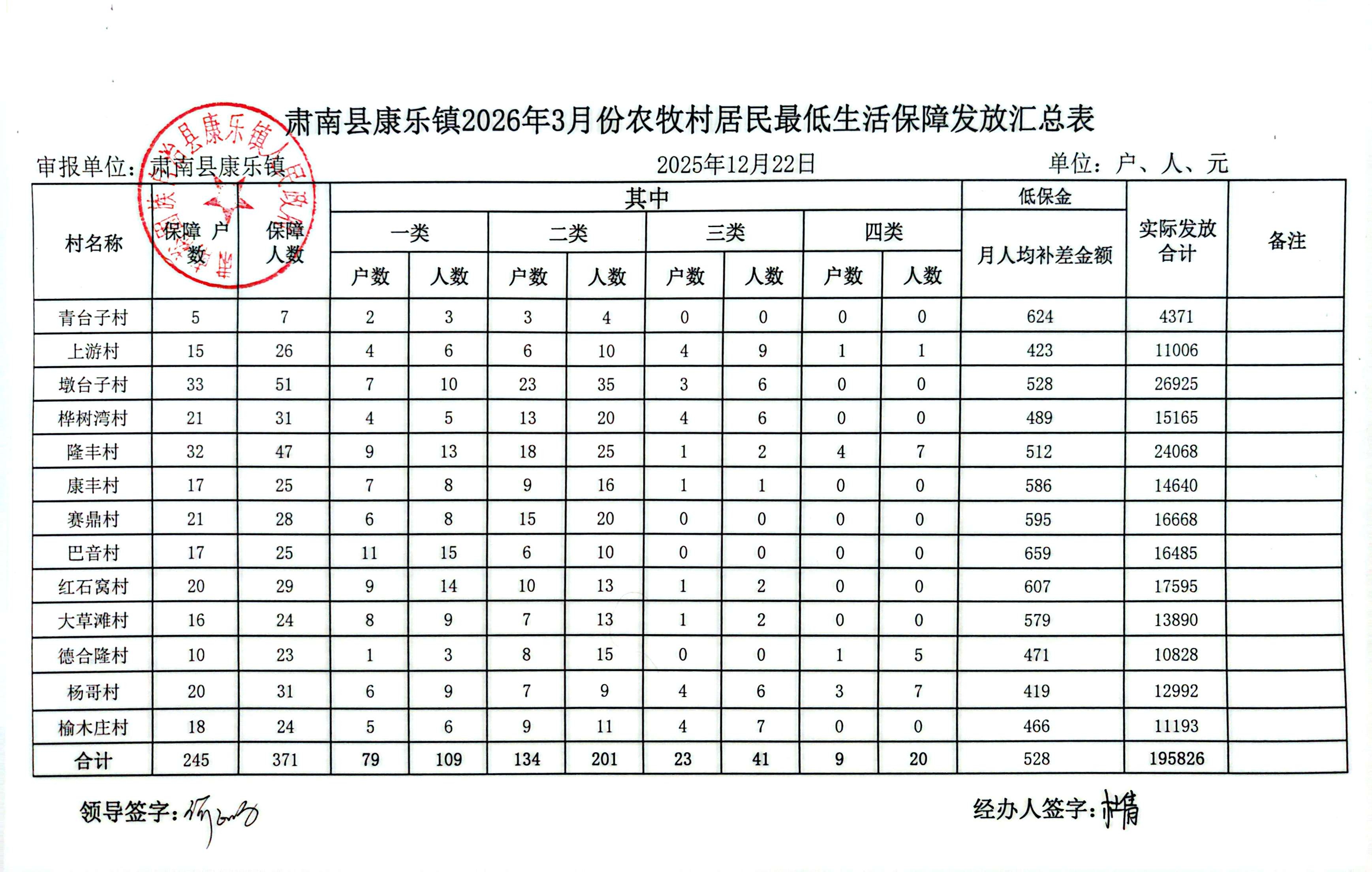 肃南县康乐镇2026年3月份农牧村居民最低生活保障发放汇总表