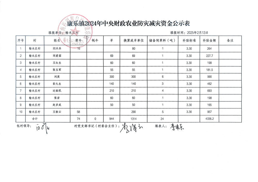 康乐镇榆木庄村2024年中央财政农业防灾减灾资金公示表