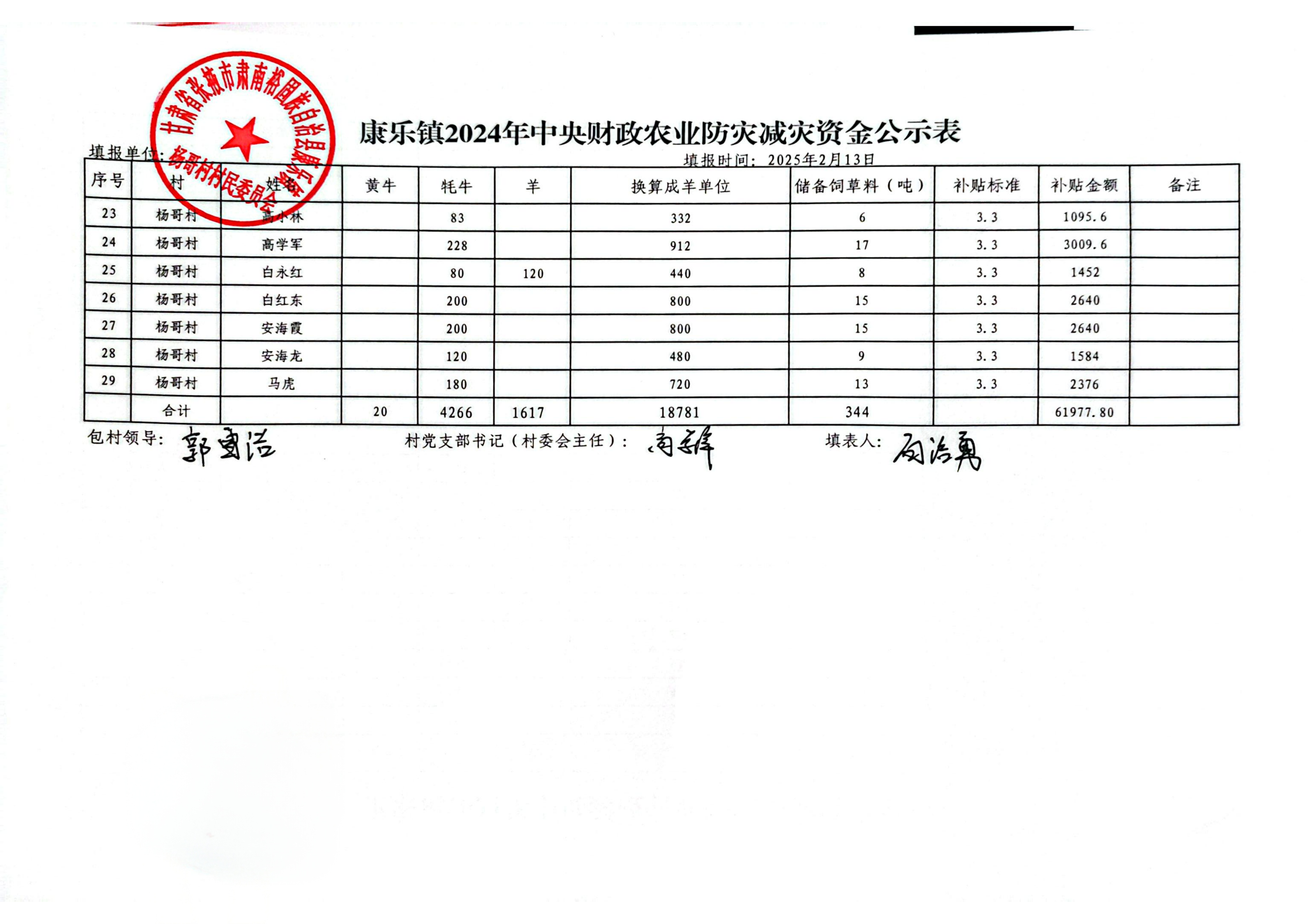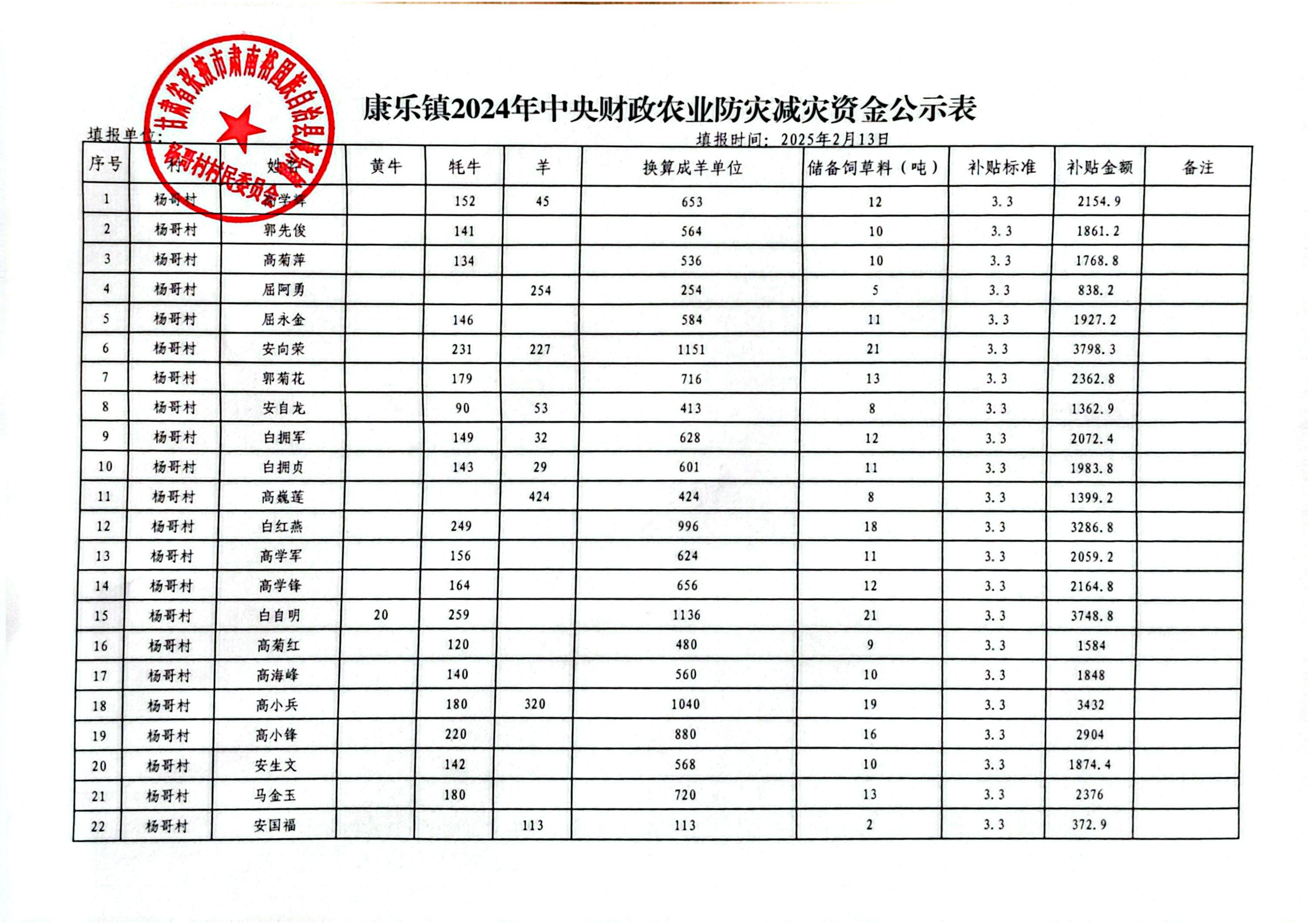 康乐镇杨哥村2024年中央财政农业防灾减灾资金公示表