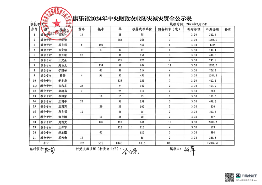 康乐镇墩台子村2024年中央财政农业防灾减灾资金公示表