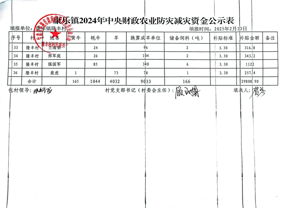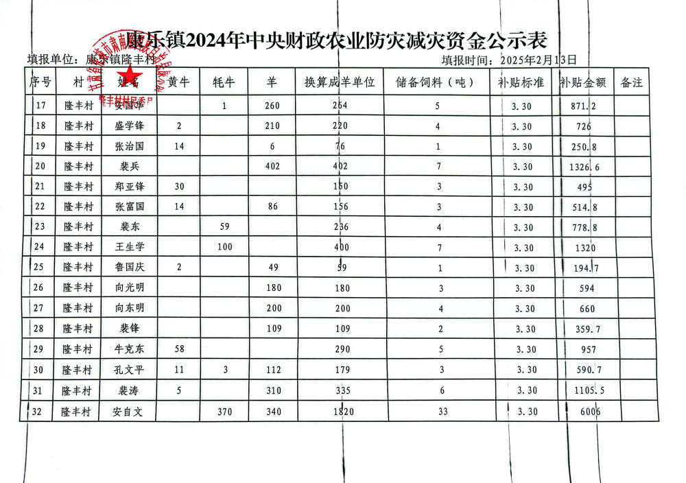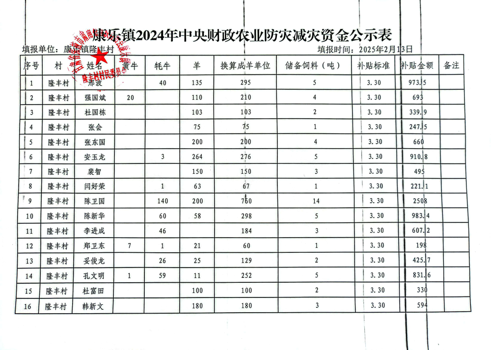 康乐镇隆丰村2024年中央财政农业防灾减灾资金公示表