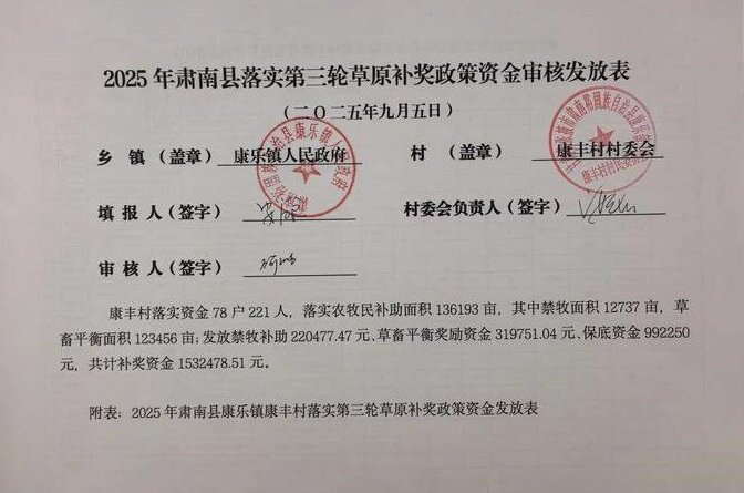 2025年肃南县康乐镇康丰村落实第三轮草原补奖政策资金审核发放表