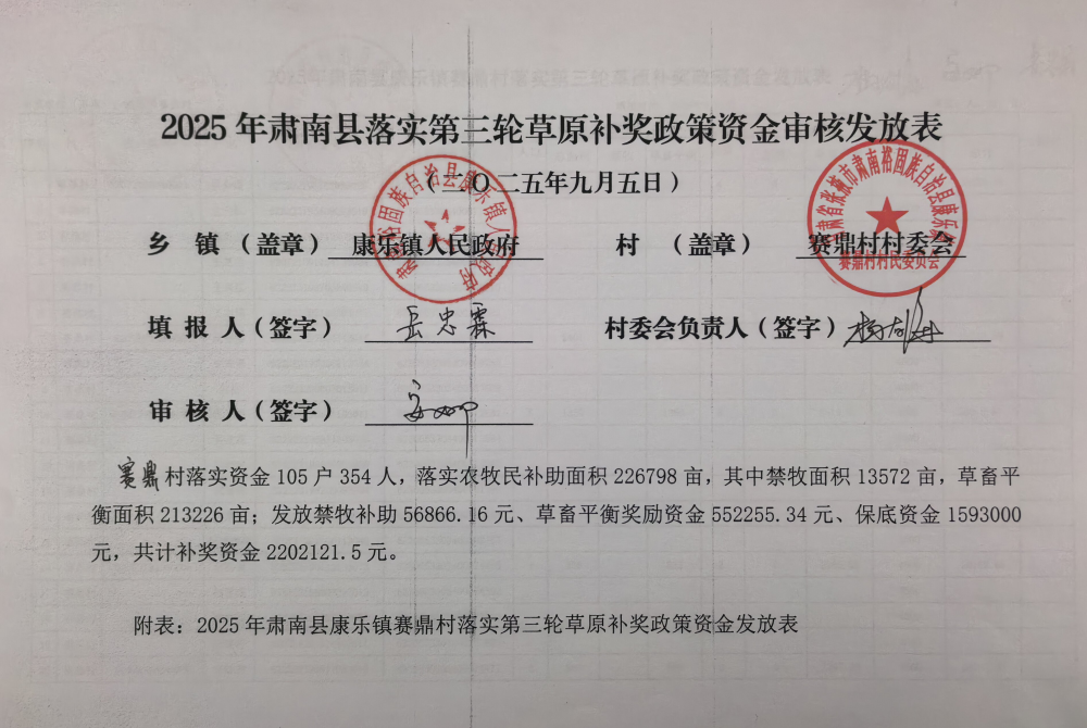 2025年肃南县康乐镇赛鼎村落实第三轮草原补奖政策资金审核发放表