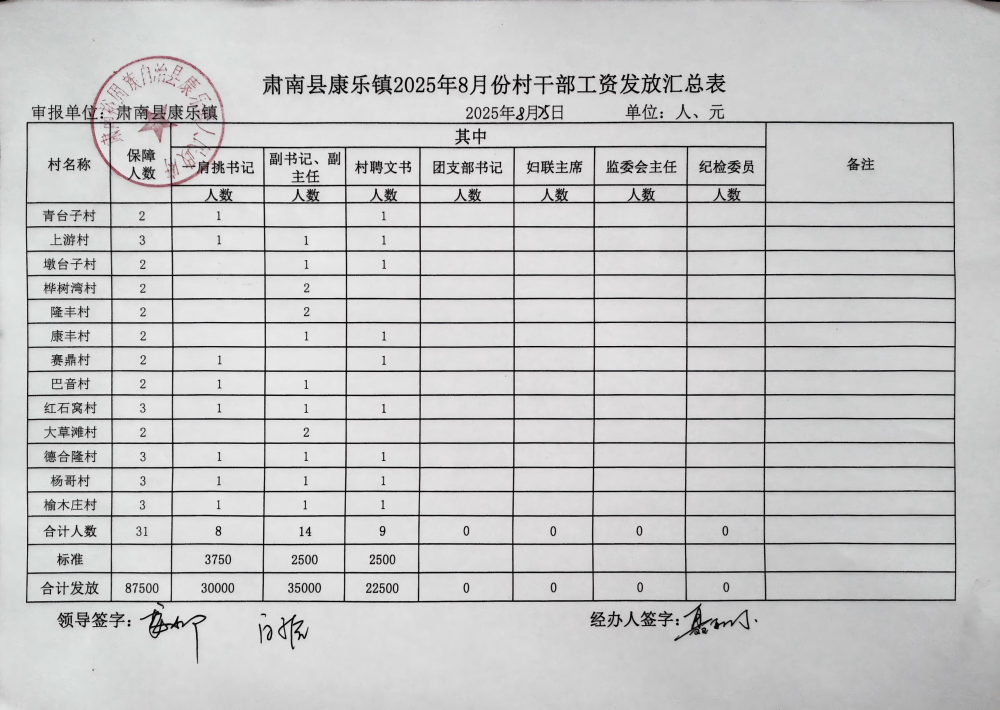 肃南县康乐镇2025年8月份村干部工资发放汇总表