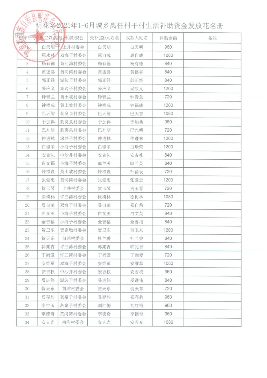 2025年1-6月城乡离任村干部生活补助资金发放名单