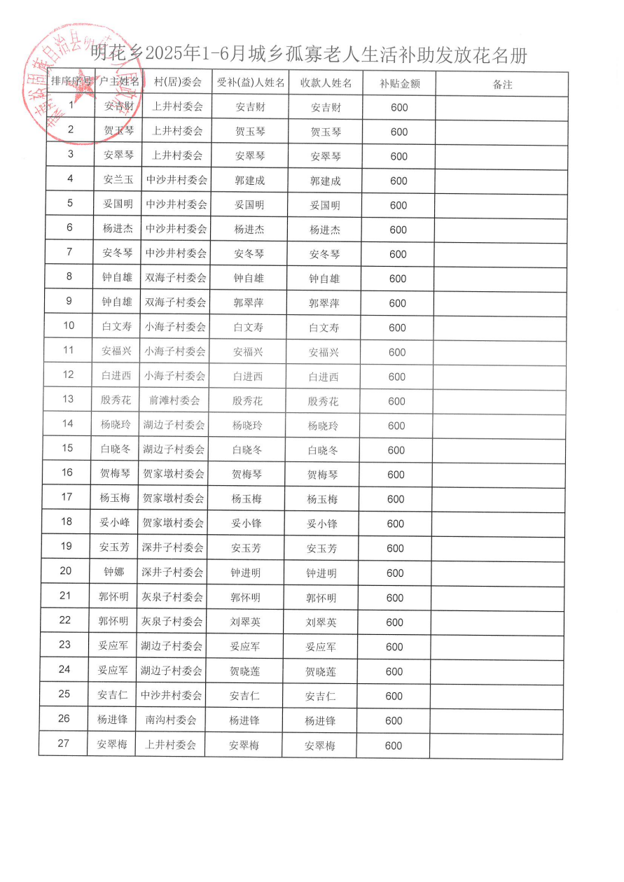 2025年1-6月城乡孤寡老人生活补助发放名单