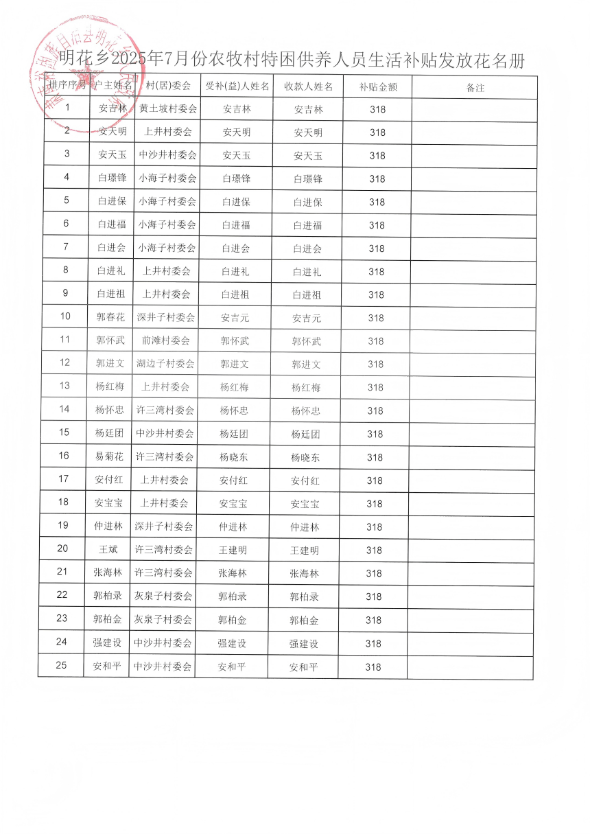 2025年7月农牧村特困供养人员生活补贴发放名单