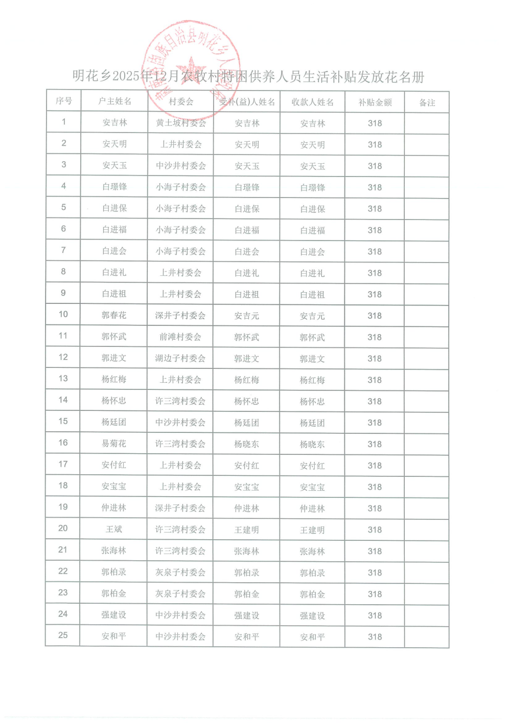 2025年12月农村特困供养人员生活补贴发放名单
