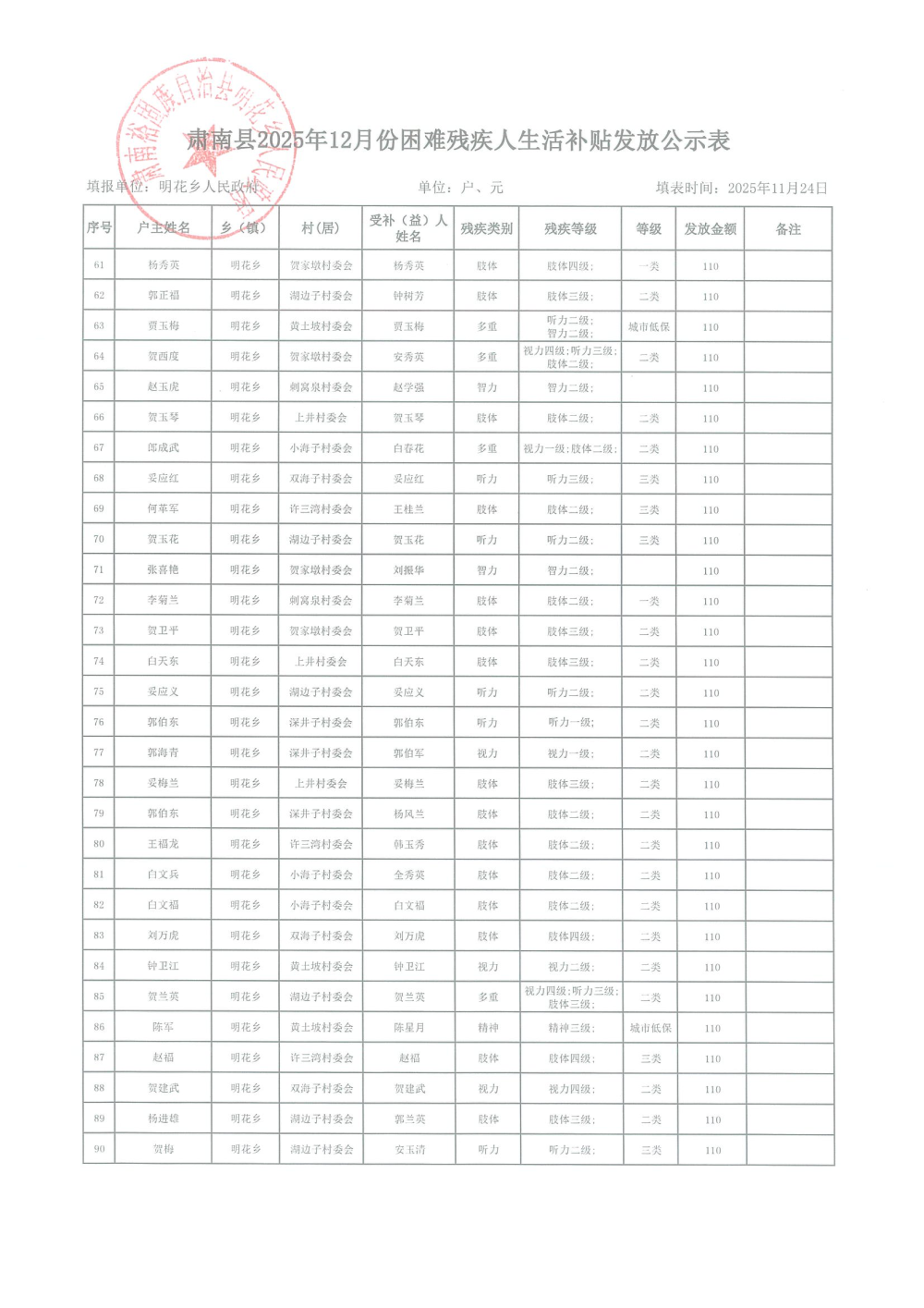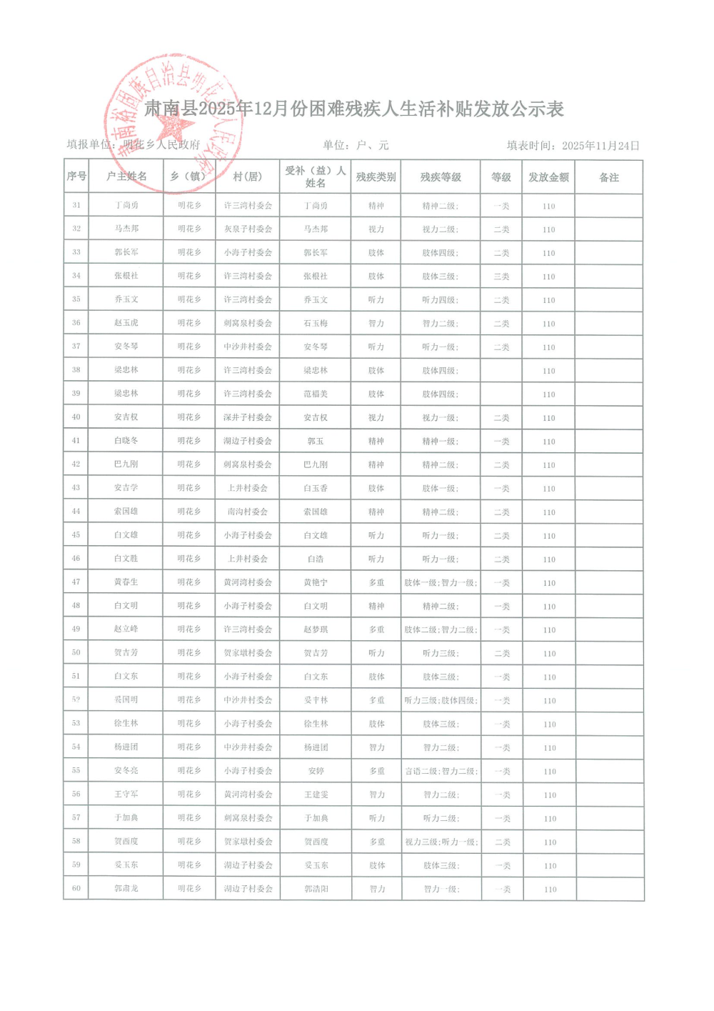 2025年12月困难残疾人生活补贴发放表