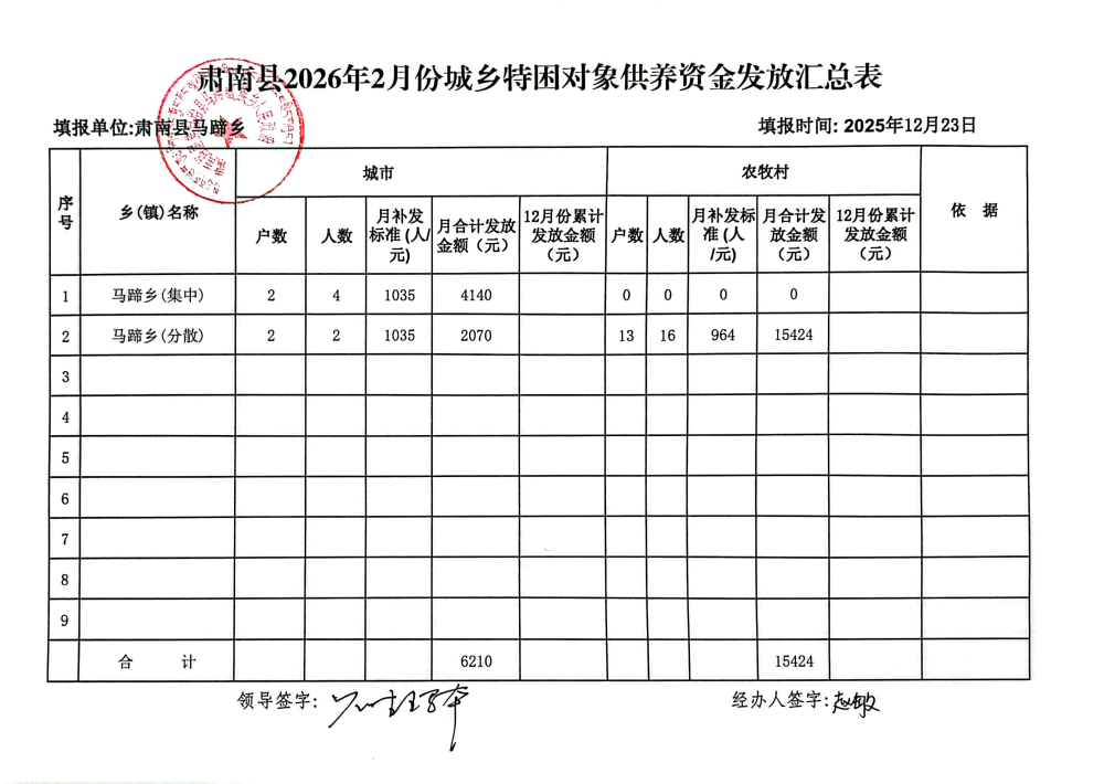 马蹄藏族乡2026年2月城乡特困对象供养资金发放表