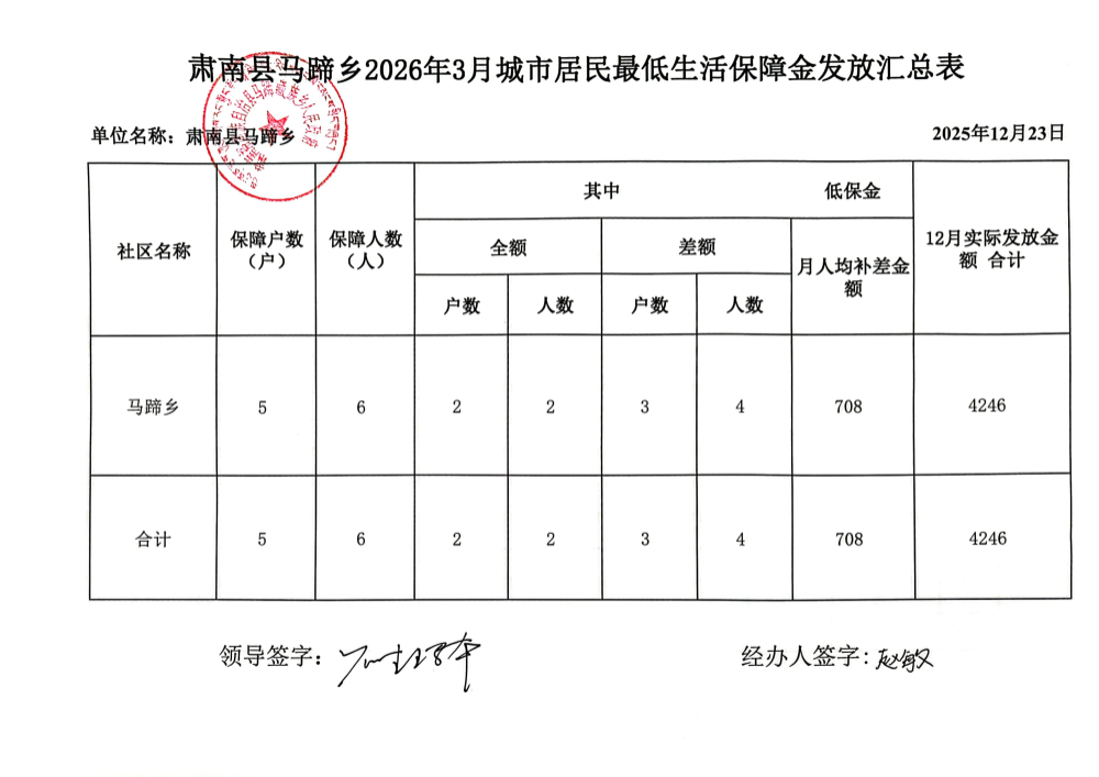 马蹄藏族乡2026年3月城市居民最低生活保障金发放表