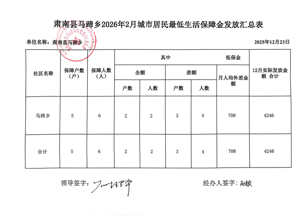 马蹄藏族乡2026年2月城市居民最低生活保障金发放表