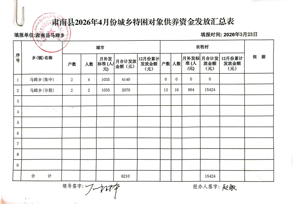 马蹄藏族乡2026年4月城乡特困对象供养资金公开