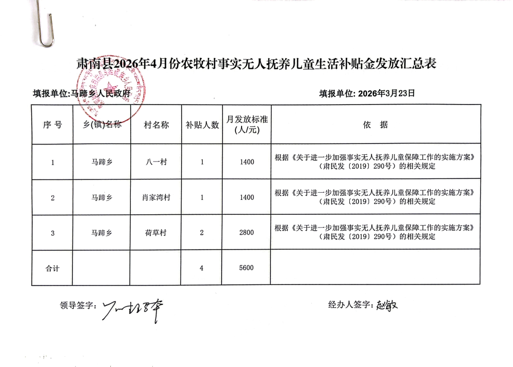 马蹄藏族乡2026年4月农牧村事实无人抚养儿童生活补贴资金公开