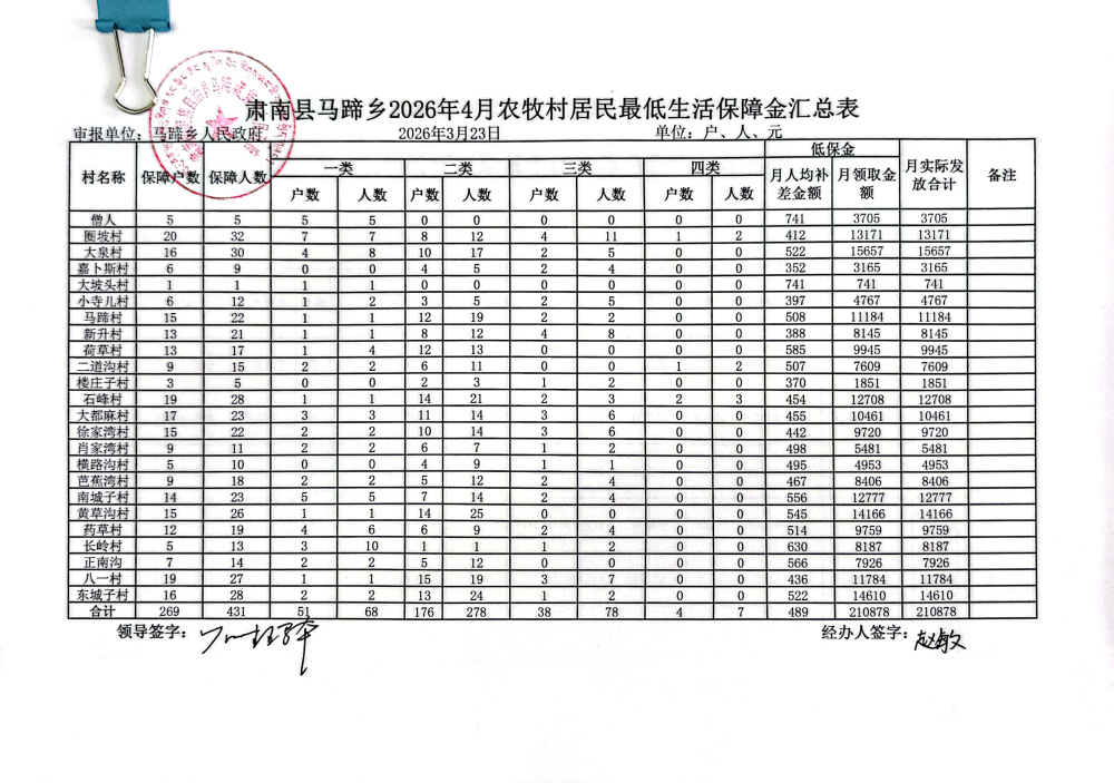马蹄藏族乡2026年4月农牧村居民最低生活保障金公开