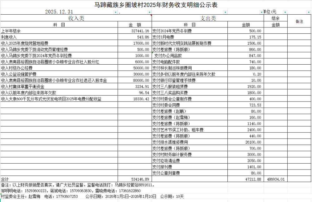 马蹄藏族乡圈坡村2025年第四季度财务收支明细公示表