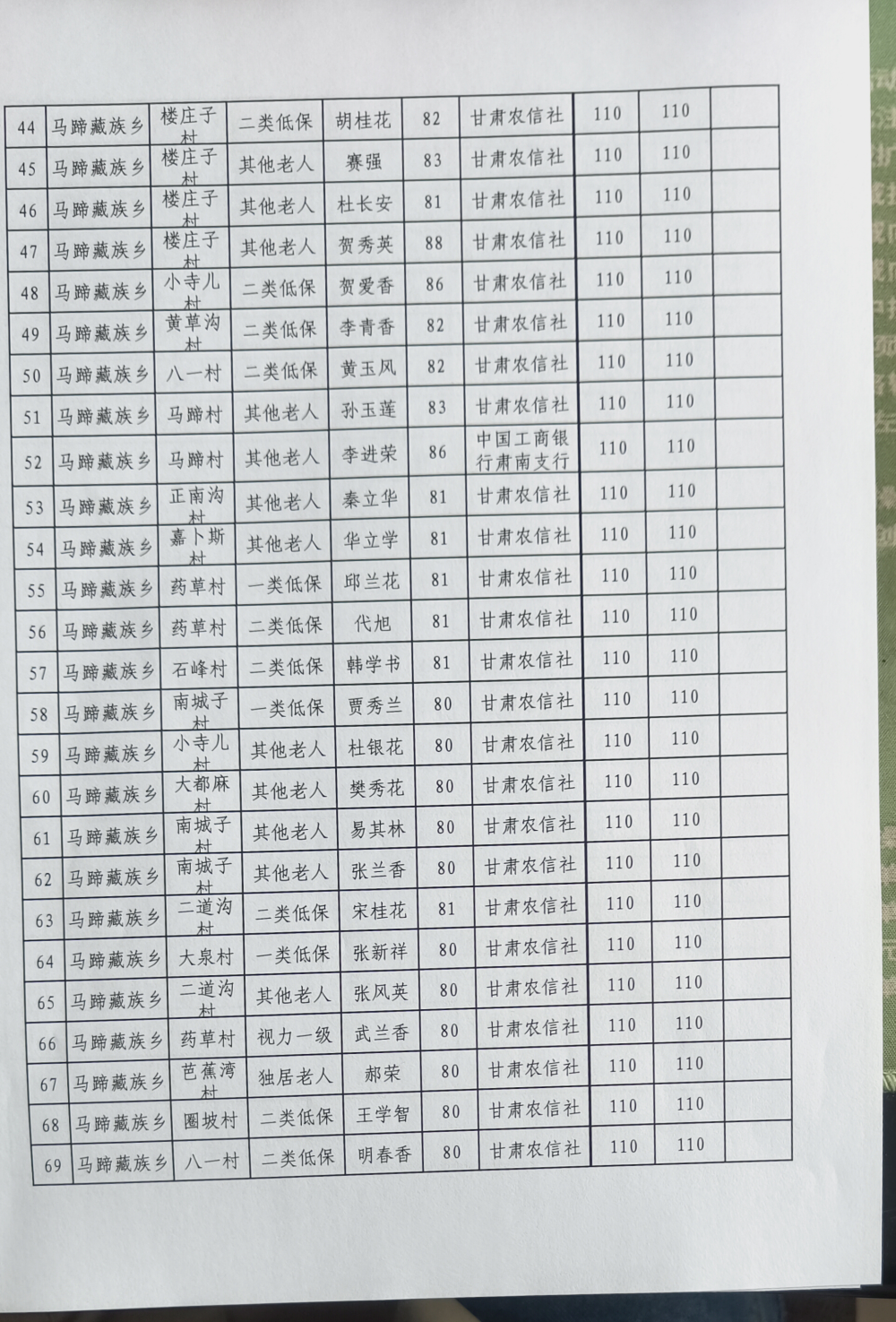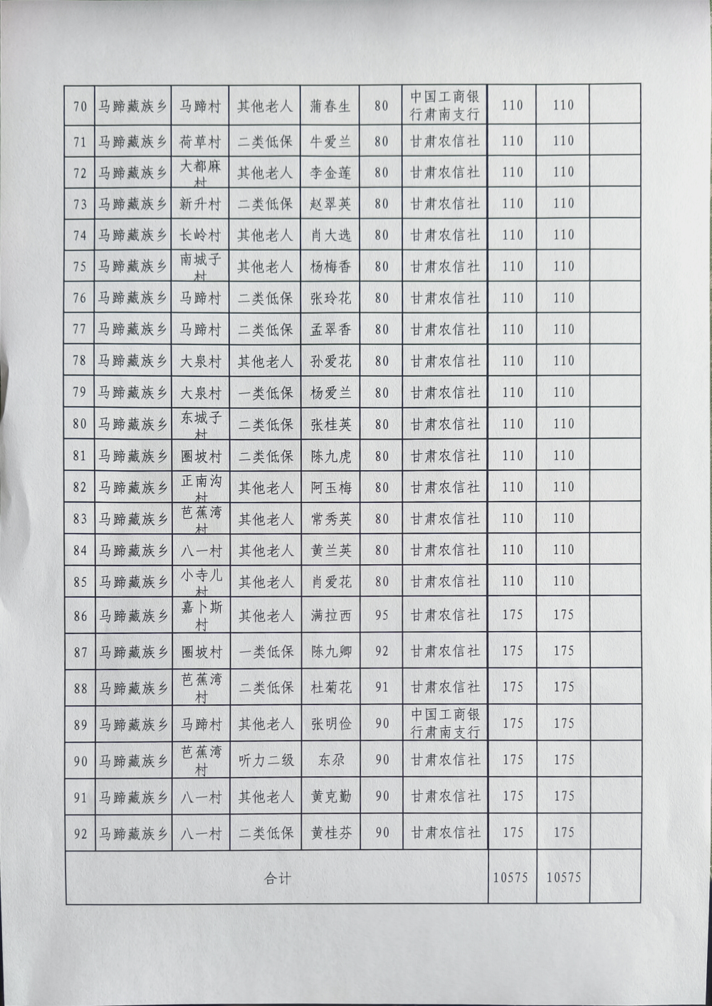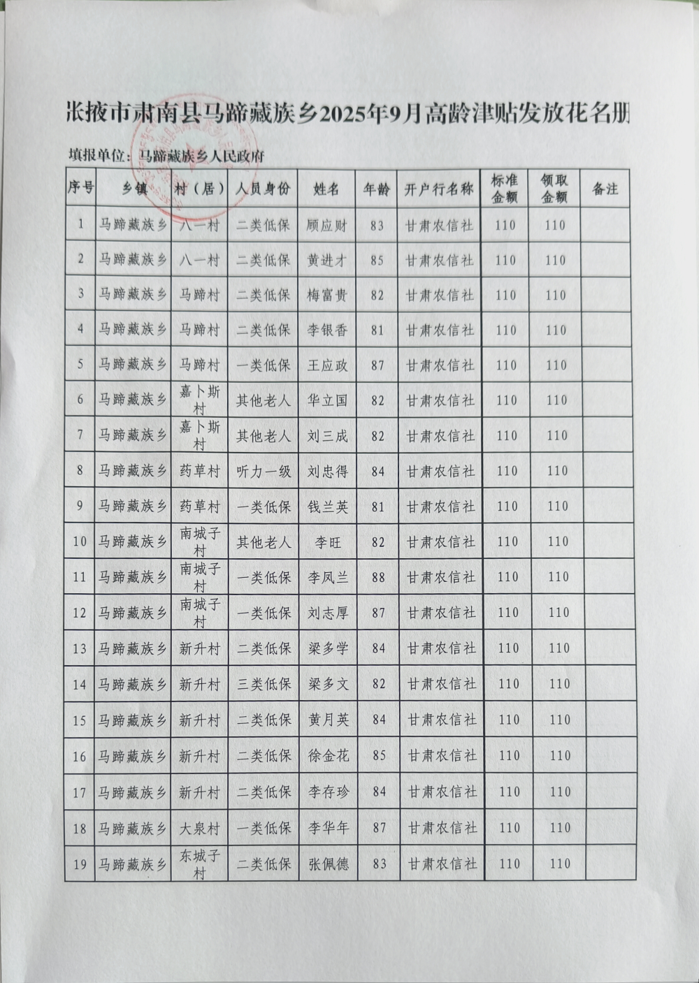 肃南县马蹄藏族乡2025年9月份高龄津贴公示
