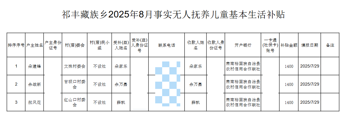 祁丰藏族乡2025年8月事实无人抚养儿童基本生活补贴