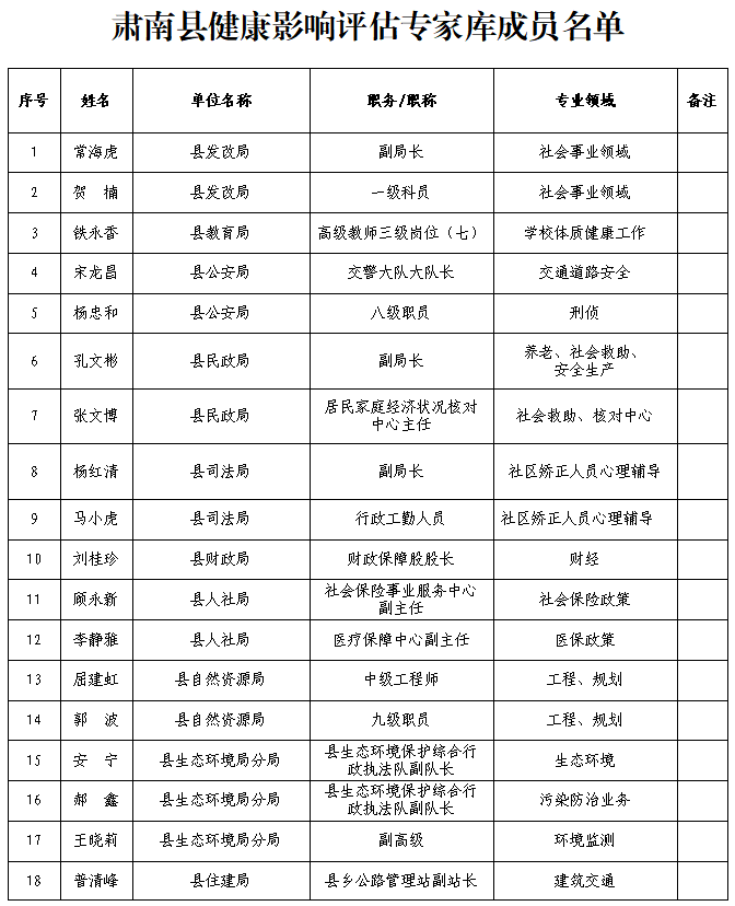 为切实推进肃南县健康影响评估制度试点工作,充分发挥专业人员在健康影响评估工作中的技术支撑作用,切实推动“将健康融入所有政策”策略落地实施,按照张掖市人民政府办公室《关于印发张掖市健康影响评估制度建设工作实施方案(试行)的通知》(张政办发〔2024〕63号)要求,经研究,决定建立肃南县健康影响评估工作联席会议制度。组成人员和职责如下: