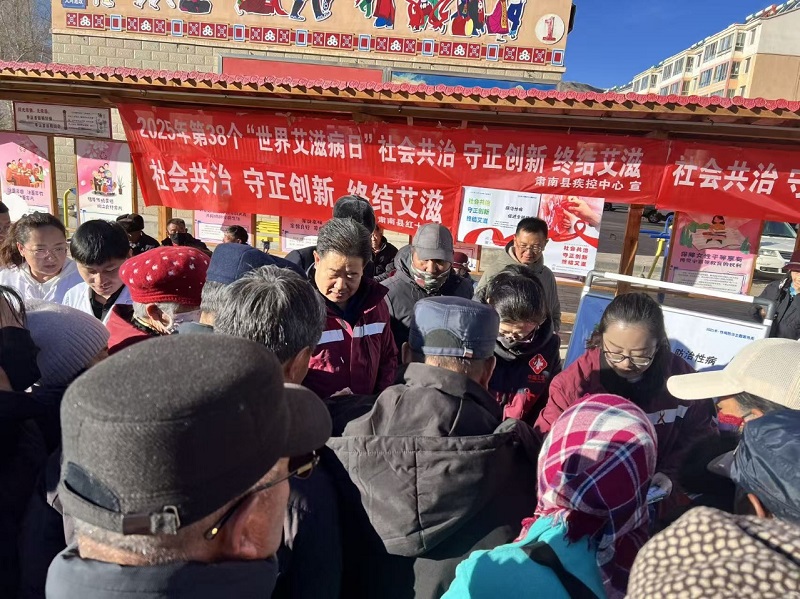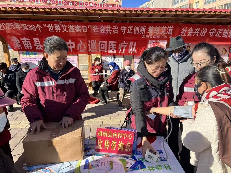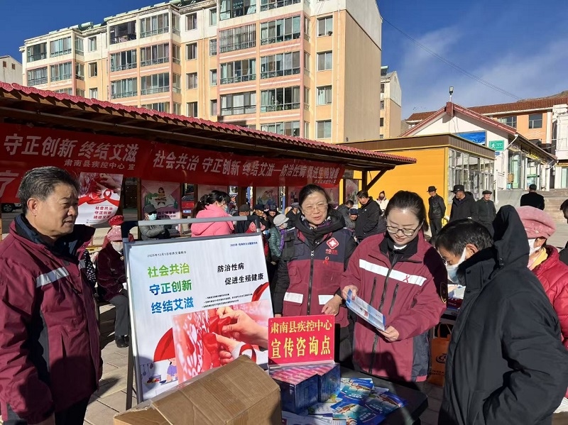 活动过程中,肃南县疾控中心联合县红十字会、县人民医院、县民族医院、县妇幼保健院、大河乡中心卫生院等专业人员20余人,通过悬挂横幅、摆放展板、发放宣传资料等形式,在人群集中的喇嘛湾台子小广场开展了宣传活动。专业人员向群众普及艾滋病传播途径、预防措施及检测治疗政策等知识,耐心解答群众疑问,用通俗易懂的语言消除大家对艾滋病的恐惧与误解,倡导关爱艾滋病病毒感染者和病人,营造理解包容的社会环境。