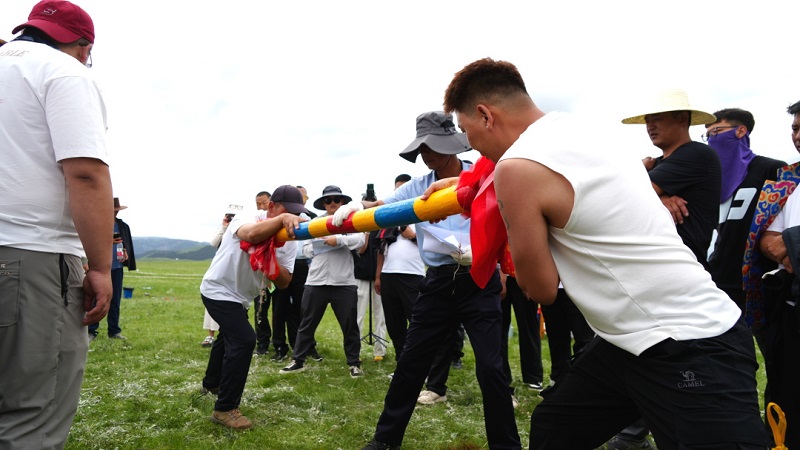 传统体育竞技,呐喊声里跃动的民俗魂。“加油!再加把劲!”在比赛现场,欢呼声响彻云霄。传统体育项目成了全场的“流量担当”,套绳、拉爬牛、顶杠子、拔棍等项目依次登场,选手们身着民族服饰,眼神里满是较劲的执拗。在拉爬牛赛场,两位壮汉弯腰弓背,双手紧扣地面,脚蹬地面发力,额头上的汗珠顺着脸颊滚落。“这可不是简单的力气活,得讲究巧劲,就像咱们祖辈放牧时跟牛较劲那样!”来自杨哥村的选手白浩鹏赛后抹了把汗,黝黑的脸上笑开了花。“小时候看父辈们玩,现在自己站上赛场,感觉浑身都是劲儿!”在趣味项目比赛区更是热闹非凡。投壶比赛前,来自张掖市的游客小李正踮着脚瞄准壶口,身后的女儿举着小旗子喊:“妈妈加油!像姑姑射箭那样准!”这些传统体育活动,不仅是力量的较量,更是文化传承的生动载体,促进了各族群众交流互动,让“有形交往”平台活力满满,在奔跑、竞技、协作中,不同民族的情感悄然交融,让文化的活力在互动中愈发旺盛。