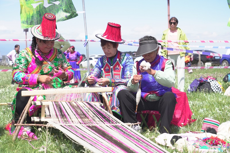 手工技艺体验,针线里交织的融合情。“融入现代生活——非遗正青春”非遗项目展示同步开展。红石榴广场上,织褐子、捻线、宝敖、刺绣等原生态非遗项目体验区有序排布。非遗传承人现场教学,游客穿梭其间,参与关键制作步骤,拍照打卡的同时,深入了解技艺背后的民族文化。不远处的刺绣体验区,7岁的小男孩正举着针线,在现场老师的指导下给一块布绣“太阳”。他扎歪了好几针,却不肯放下:“阿姨说,这是裕固族奶奶们绣在帐篷上的图案,能带来温暖!我要绣好带回家给奶奶看!”一旁的非遗传承人满是欣慰,“以前总担心这些手艺没人学,现在看孩子们愿意碰、愿意问,就知道这些文化能活下去,还能活得更年轻!”