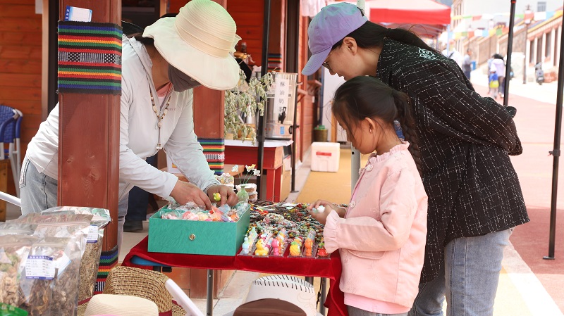 “你看挂着的这些衣服,上面绣的吉祥八宝、雪山牦牛图案,都是找老手艺人缝的,每一件都不一样。”6号售卖亭经营者金德富随手拿起一件藏袍,“有的姑娘拿起藏式围裙就往身上比,小伙子会问‘这藏袍日常穿方便不’,我都跟他们细细说,其实我卖衣服不光是挣点钱,更想让来这儿的人,能了解我们的藏族服饰文化,能带走件真真正正有藏乡韵味的东西。”