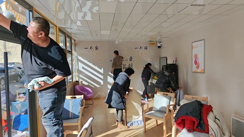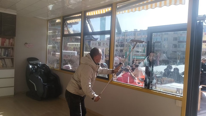 活动中,保洁员们分工明确、干劲十足。大家手持扫帚、抹布、水桶等工具,重点对驿站内外地面进行彻底清扫,细致捡拾地面烟头、纸屑,清理墙角、窗台、桌椅缝隙等卫生死角的灰尘杂物;同时认真擦拭驿站门窗玻璃、公共座椅、服务柜台等设施,不放过任何一处污渍。经过一上午的辛勤劳作,两座驿站卫生环境焕然一新,玻璃洁净透亮,地面清爽整洁,各类设施摆放整齐,整体面貌得到显著提升。