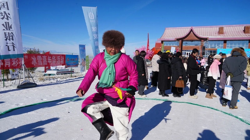 滑雪表演的激情尚未褪去,极具民族特色的锅庄舞表演便接踵而至。身着民族服饰的演员们,面带笑容,手拉手步入表演场地。伴随着欢快的音乐,演员们翩翩起舞。现场观众们也被这充满民族风情的舞蹈所感染,大家跟着音乐的节奏轻轻摇摆,沉浸在这欢乐祥和的氛围之中。此外,现场还设置了民族传统体育项目展示区,展示了如顶杠子、押加等具有代表性的民族传统体育项目。