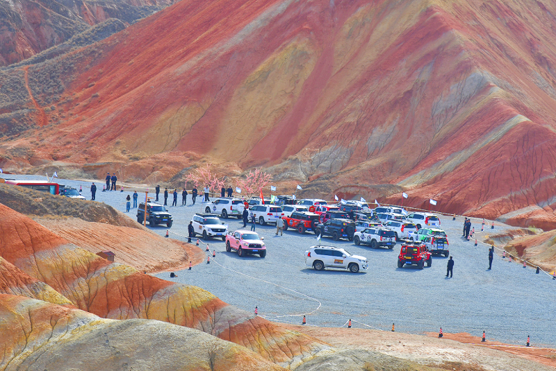 东线车队深度穿越七彩丹霞、冰沟丹霞和康乐草原。在七彩丹霞景区,山体呈现出红、黄、橙、白等多种颜色,层理分明。随后,车队抵达冰沟丹霞景区门口,车友们在此打卡拍照,并观看了当地裕固族群众表演的民族歌舞,在领略地质奇观的同时感受浓郁的民族文化风情。之后,车队继续前往康乐草原,在雪山映衬的草场中徜徉打卡,完成东线穿越之旅。