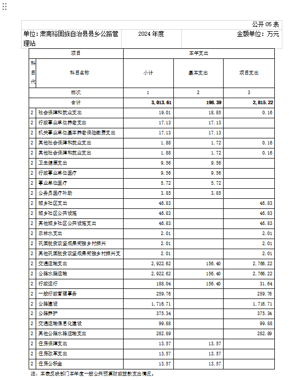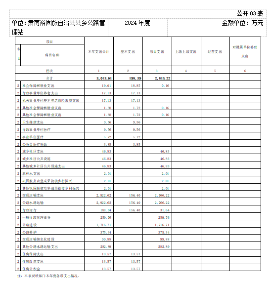 2024年度一般公共预算财政拨款支出3013.61万元,主要用于以下方面:社会保障和就业支出19.01万元,占0.63%;卫生健康支出9.56万元,占0.32%;节能环保支出0.00万元,占0.00%;城乡社区支出46.83万元,占1.55%;农林水支出2.01万元,占0.07%;交通运输支出2922.62万元,占96.98%;住房保障支出13.57万元,占0.45%。