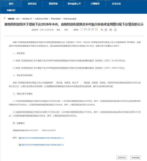 附件8:关于提前下达2026年中央、省级财政衔接推进乡村振兴补助资金预算分配下达情况的公示.png