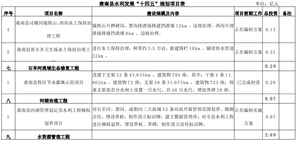根据全县水系格局、城镇分布、产业发展情况,按照“具有相关规划依据、符合开发利用条件、具备前期工作基础、建设条件基本成熟”的原则,围绕水资源高效利用、供水安全保障、防洪抗旱减灾、水生态环境保护4大体系目标,“十四五”期间拟实施以堤防加固、新建防洪堤为重点的中小河流综合治理工程;以农牧村饮水安全改造、取水工程、提水工程为重点的农牧村饮水改造提升工程;以境内山洪沟道整治为重点的山洪灾害防治工程;以新建塘坝、水库除险加固、雨水集蓄工程为主的抗旱水源工程;以发展升级滴灌、维修改造渠道及渠系建筑物为重点的灌区节水改造提升工程;以水土保持治理、小流域综合治理、生态造林及生态治沙工程为重点的水土保持与河湖生态修复工程;以牧区节水灌溉示范项目为重点的石羊河流域生态修复工程;以河湖管理划定及水利工程确权划界为重点的河湖治理工程;以水生态治理、智慧水利建设为主的水资源管理工程;以肃南县皇城镇北峰村、康乐镇赛鼎村两个库区移民安置区进行基础设施建设为主的水库库区和移民安置区基础设施建设项目。共10类40项水利工程,规划总投资11.32亿元(详见肃南县水利发展“十四五”规划项目表)。