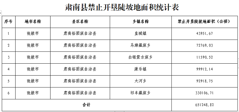 一、全县禁止开垦陡坡地面积651248.82公顷,其中:皇城镇43951.67公顷,马蹄藏族乡72769.03公顷,白银乡11590.52公顷,康乐镇99912.14公顷,大河乡92918.75公顷,祁丰藏族乡330106.71公顷(详见附件)。矢量范围请在水务局或所在地乡(镇)人民政府进行查询。